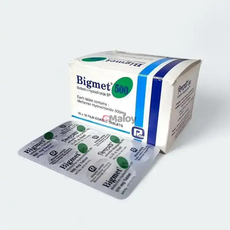 Presentation:Bigmet 500 tablets contain 500 mg of metformin hydrochloride.They are typically film-coated and are available in blister packs or strips.