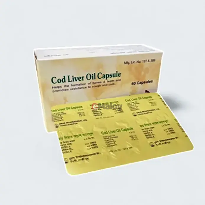 Presentation: Cod Liver Oil is available in both capsule and liquid formulations. The capsules typically contain a specific amount of cod liver oil, providing Vitamin A and Vitamin D, as well as Omega-3 fatty acids (EPA and DHA). The liquid formulation is pure cod liver oil, with the amounts of vitamins and fatty acids varying per dose (usually per teaspoon or tablespoon). The specific amounts of each component will be detailed on the product packaging available in Bangladesh.
