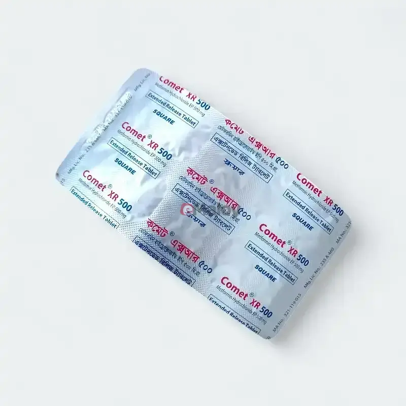 Presentation:Comet XR 500 Tablet, available in Bangladesh, contains Metformin Hydrochloride BP 500 mgin an extended-release (XR) formulation.It is usually presented as a white to off-white, oval or capsule-shaped tablet for oral administration and is available in blister packs. The "XR" designation indicates a prolonged release of the active ingredient.
