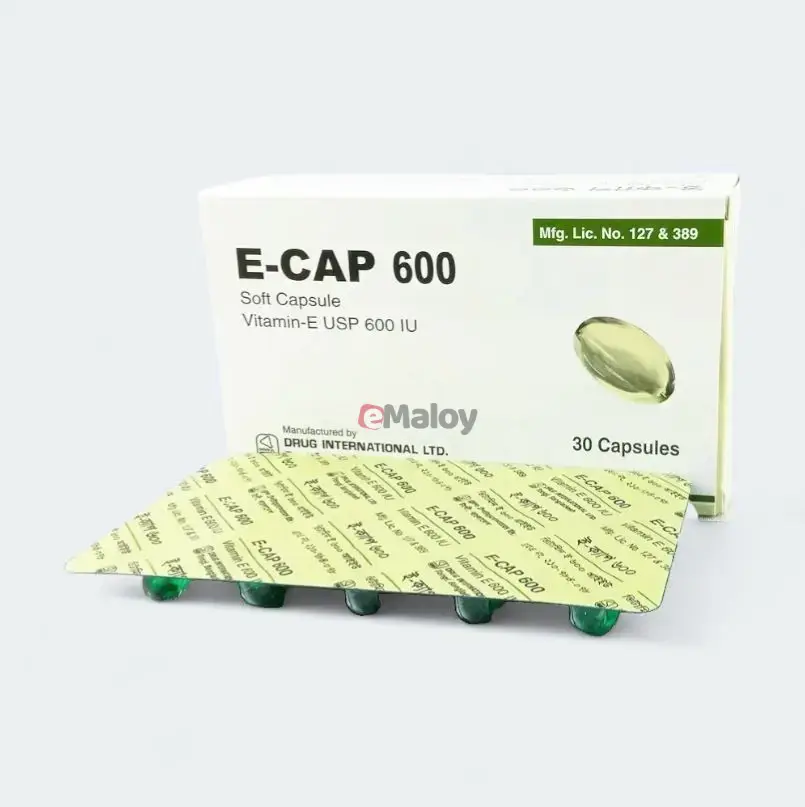 Indications: E-Cap 600 is indicated for the treatment and prevention of Vitamin E deficiency. Vitamin E is a potent antioxidant that helps protect the body's cells from damage caused by free radicals. It plays a role in immune function, blood vessel health, and preventing blood clots. It may also be used as a supportive treatment in certain conditions.