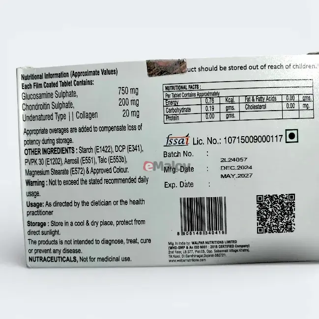 - Glucosamine Sulphate (750 mg): Helps build and repair the cartilage that cushions the joints.