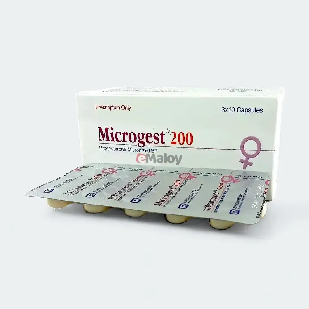 Presentation:Microgest 200 Capsule, available in Bangladesh, contains Progesterone (micronized) 200 mg.It is usually presented as a soft gelatin capsule for oral or vaginal administration. The color and shape of the capsule may vary depending on the manufacturer (e.g., white or off-white, oval). It is typically available in blister packs.