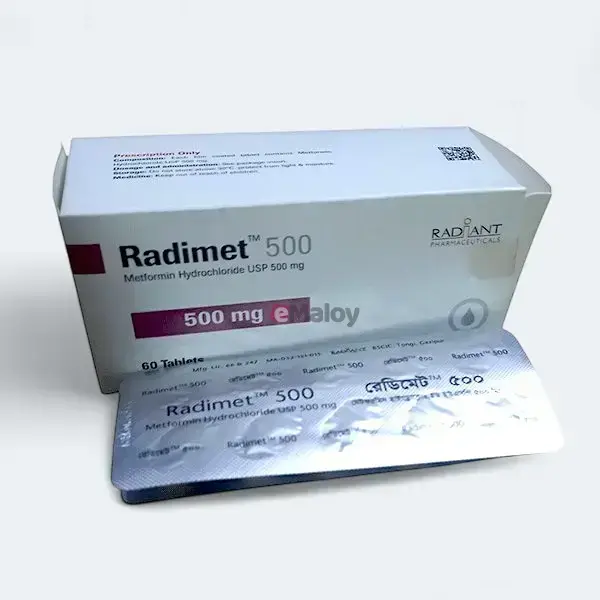 Presentation:Each film-coated tablet contains 500 mg of metformin hydrochloride.Radimet 500 tablets are typically white to off-white, round or oval-shaped, and film-coated, often with a score line. They are available in blister packs.