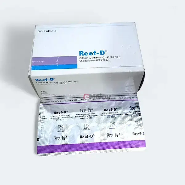 Presentation: Film-coated tablets containing Calcium Carbonate (from Coral source) and Vitamin D3 (Cholecalciferol). The strength of Calcium Carbonate is typically 1250 mg (equivalent to 500 mg elemental Calcium) or 1500 mg (equivalent to 600 mg elemental Calcium), and Vitamin D3 is usually 200 IU or 400 IU per tablet, depending on the specific product available in Bangladesh. The tablets are packaged in blister packs within a box.