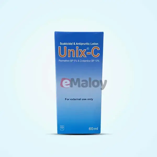Unix C Lotion - (60ml) contains a combination of two active ingredients: Permethrin (5%) and Crotamiton (10%). It is available in a 60ml bottle.